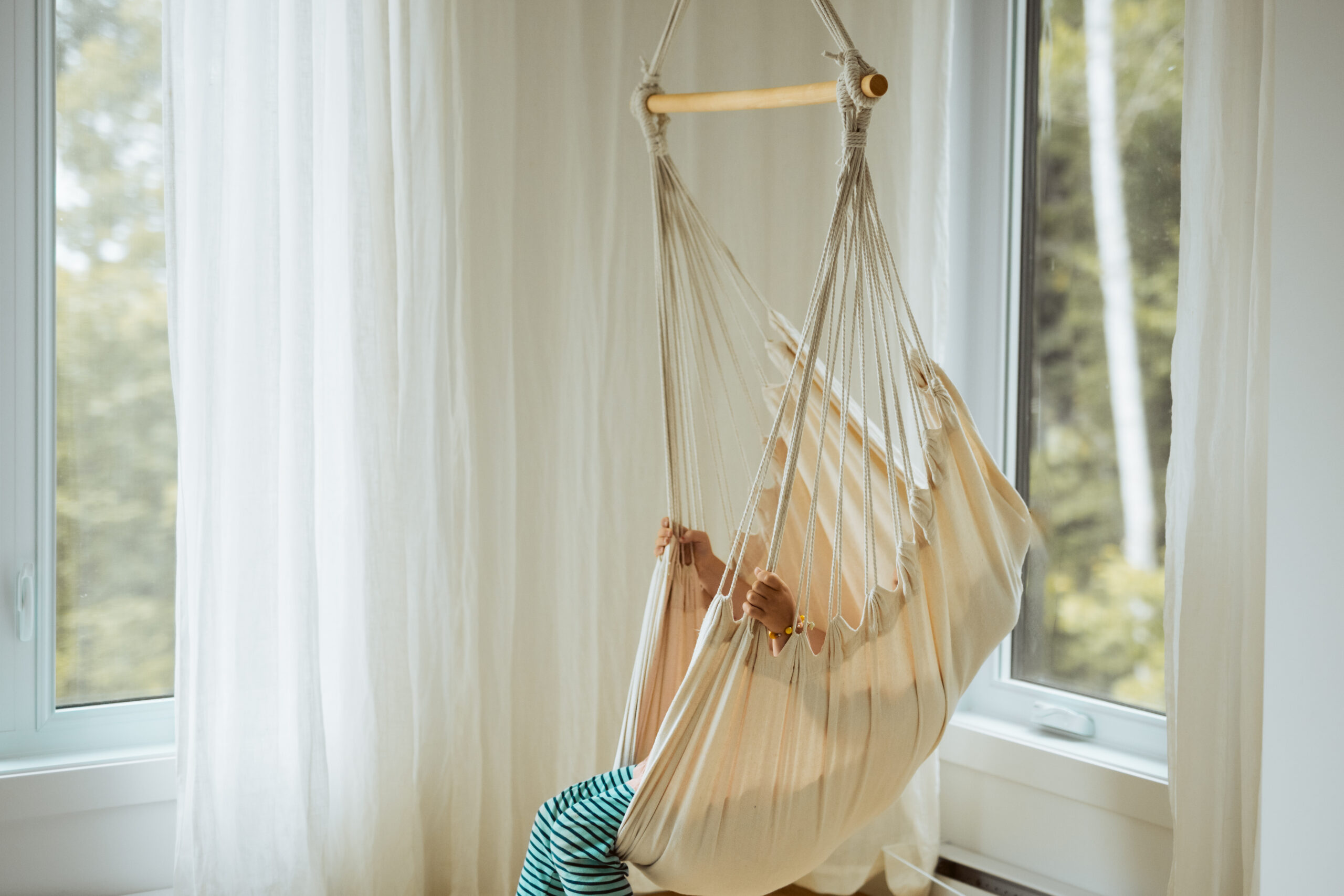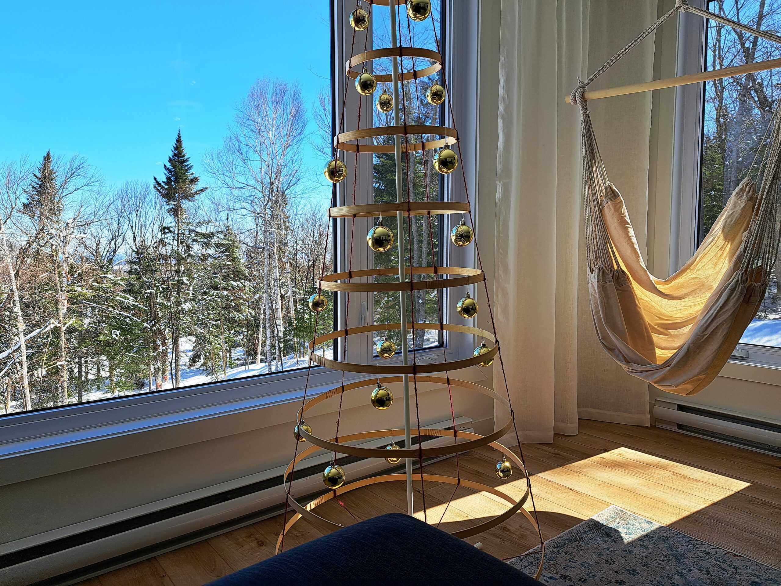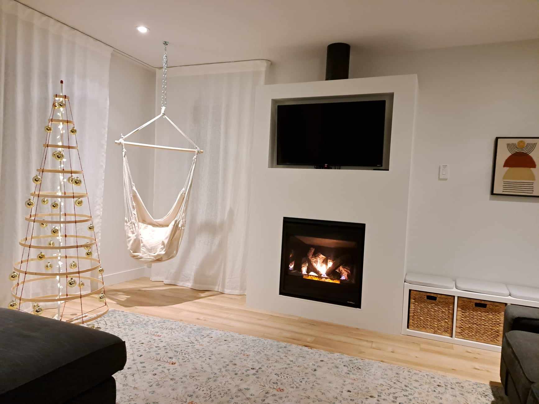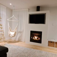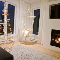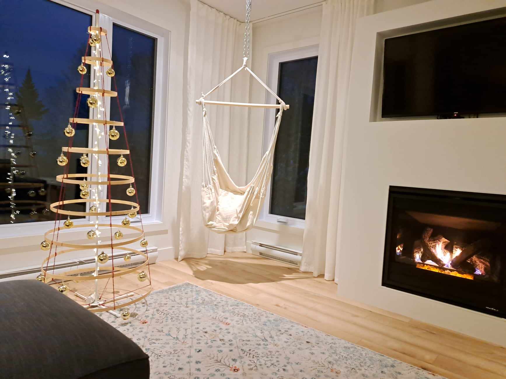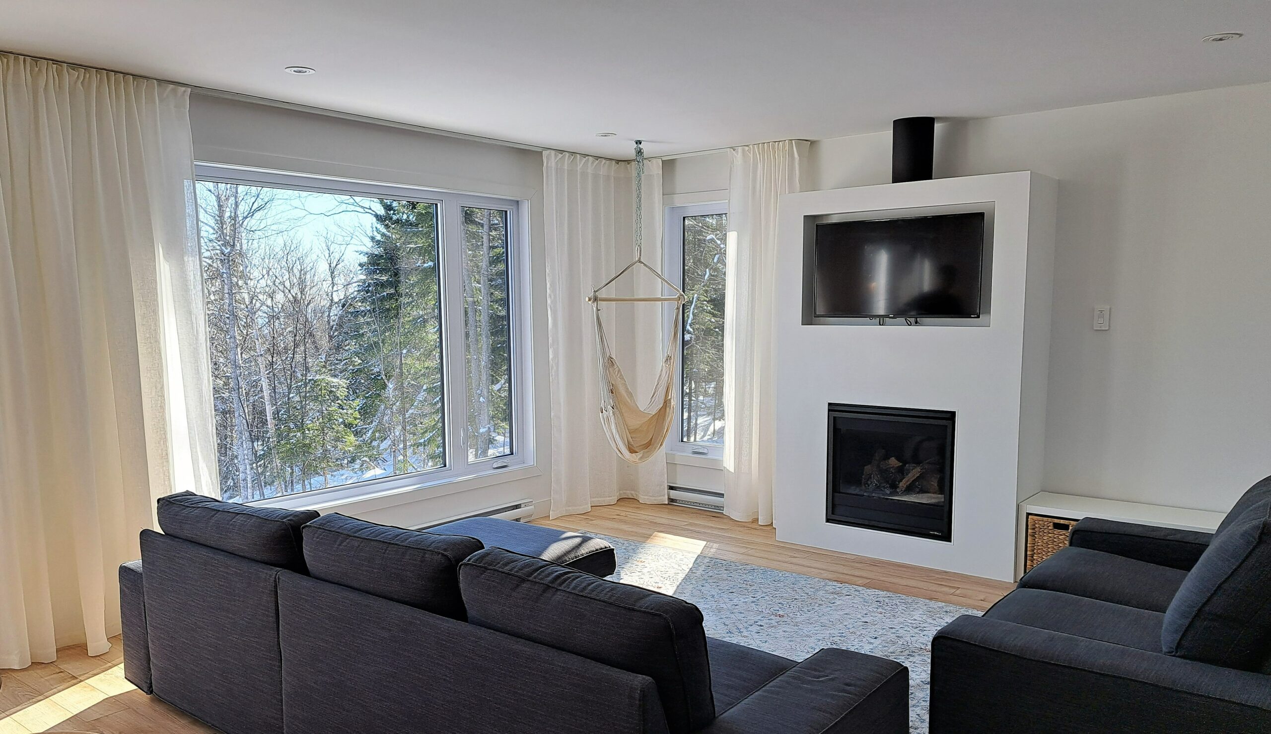 Salon lumineux et ultra cosy avec foyer au gaz, télé et coin hamac. Parfait pour relaxer au chaud après une journée à explorer Charlevoix.