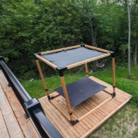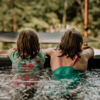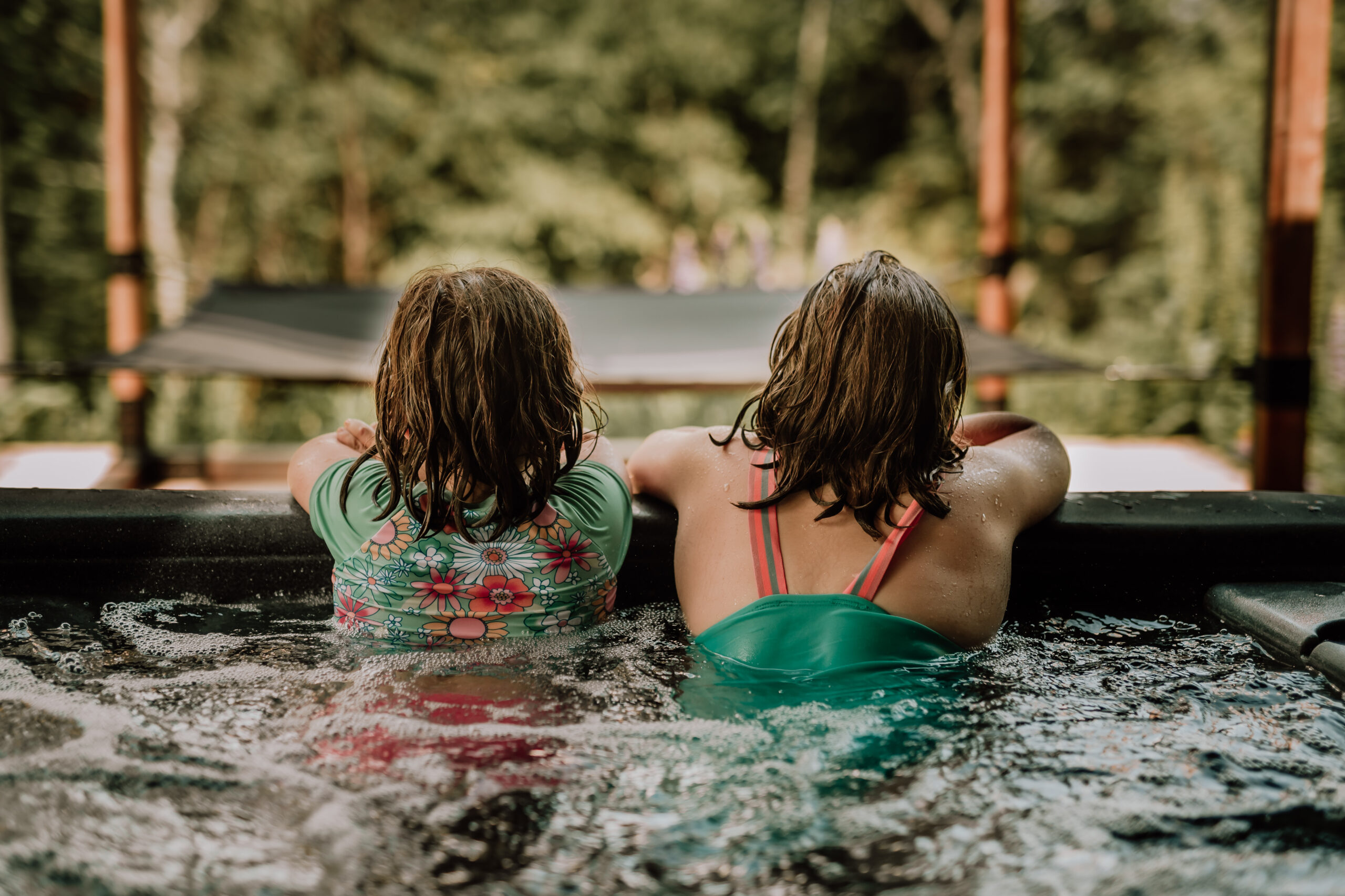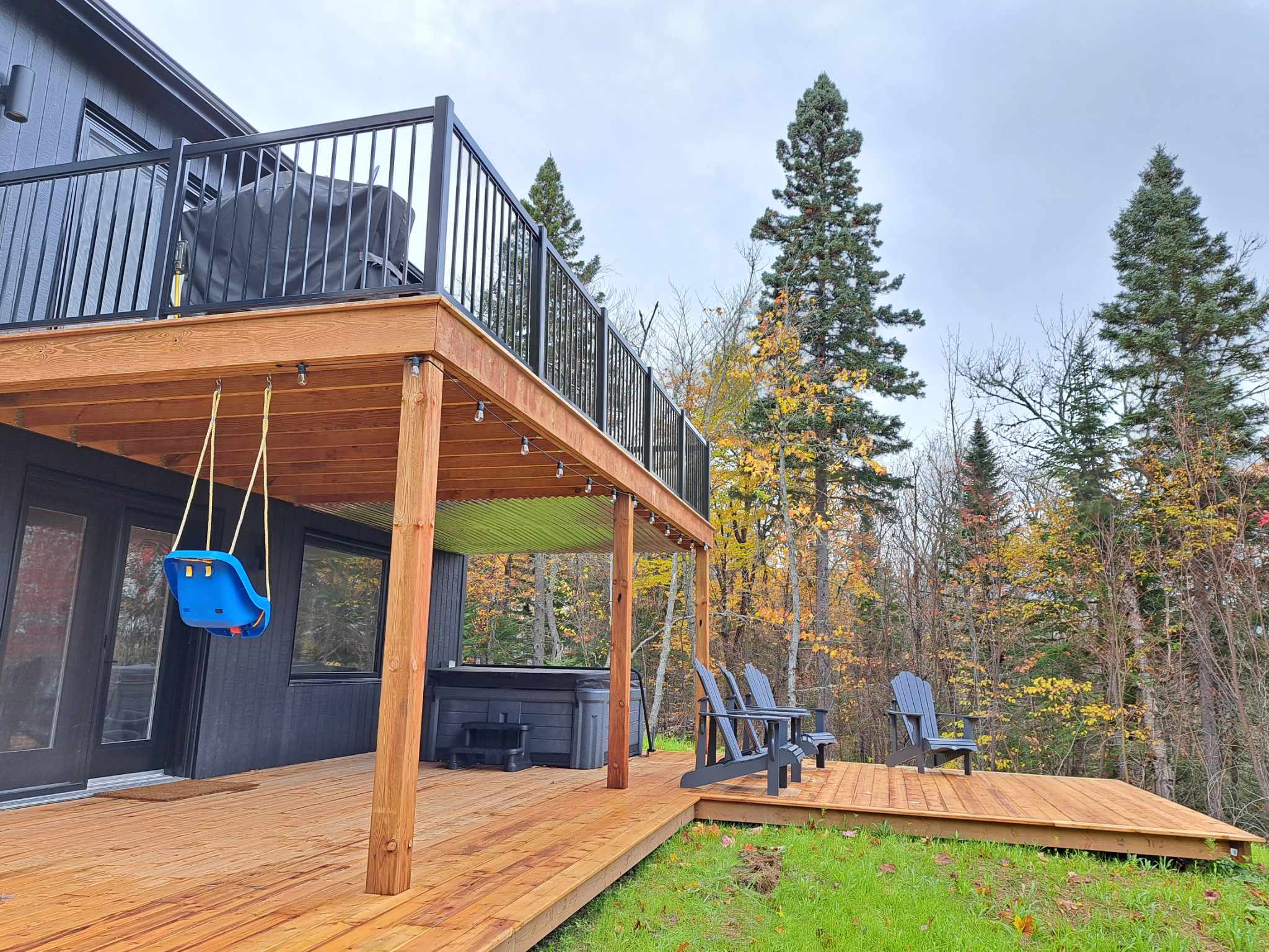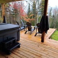 Spa extérieur sur terrasse couverte, entouré de nature l’endroit parfait pour relaxer en toute saison.