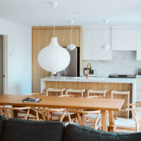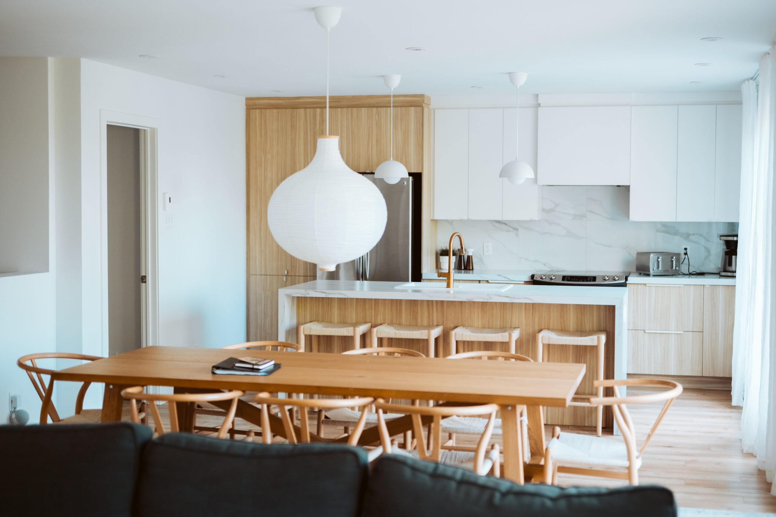 Aire ouverte lumineuse avec cuisine moderne, îlot et grande table, plus accès direct à la terrasse.